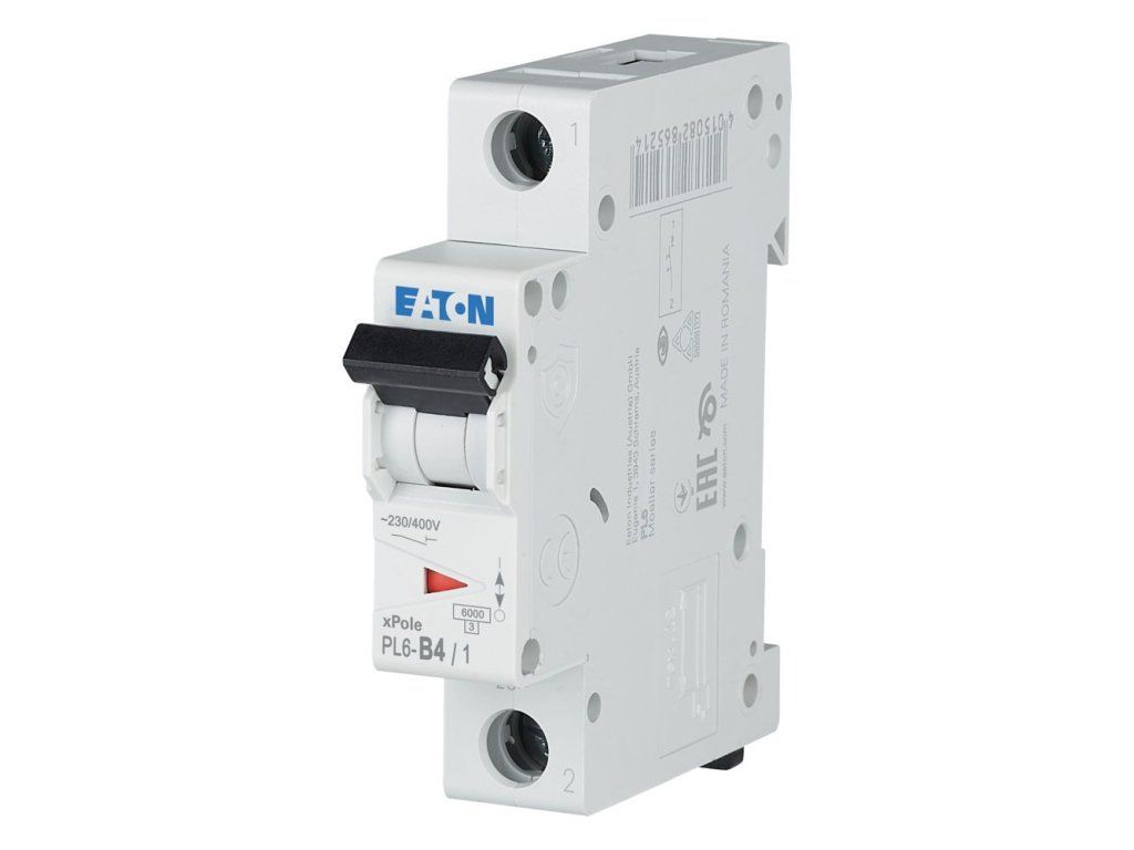 Istič (MCB) Eaton PL6-B4/1 (kód 286517) je produkt zo série xPole PL6. Technické údaje: počet pólov: 1; menovitý prúd: 4 A; menovité napätie: 230 V; charakteristika: B; skratová vypínacia schopnosť: 6 kA; moduly: 1; krytie: IP20. Normy a certifikácie: RoHS conform; IEC/EN 60898-1.Dodatočné parametre